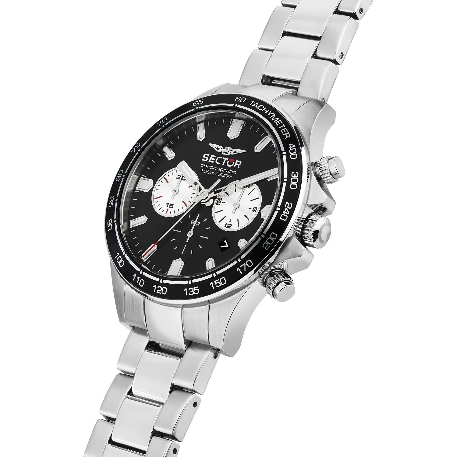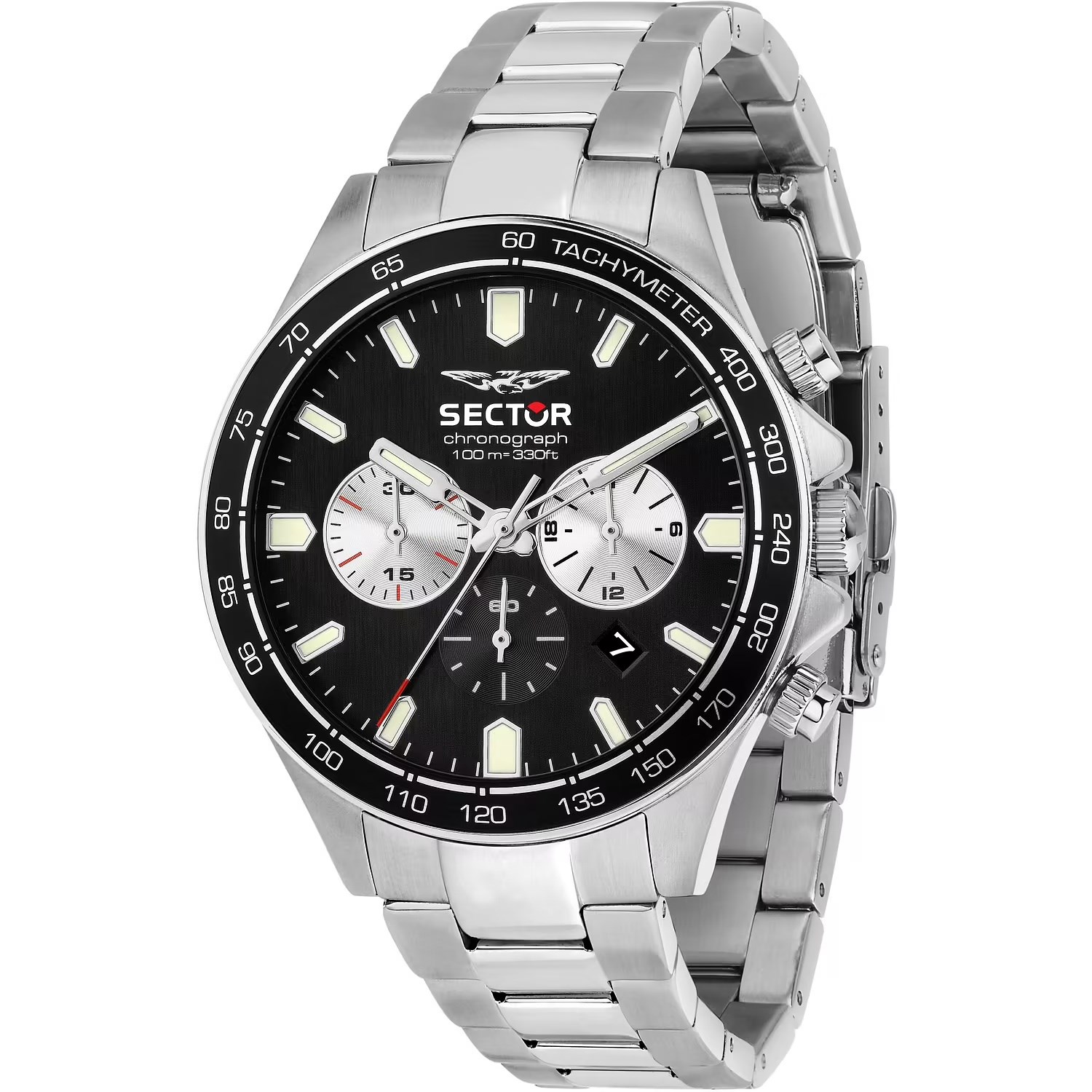 Orologio uomo sector, R3273661050, collezione 230, movimento al quarzo, cronografo, cassa in acciaio 43mm, quadrante nero con datario, vetro minerale, fondello a vite, lunetta in alluminio, bracciale in acciaio, resistenza all'acqua 10atm