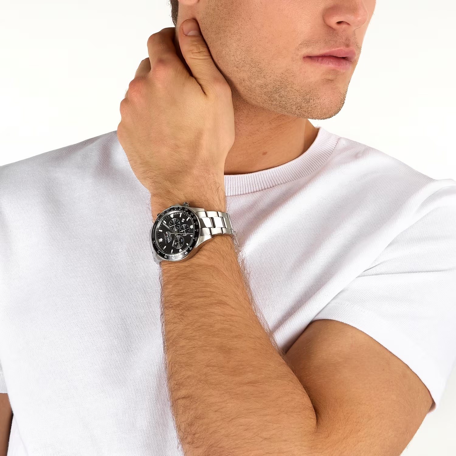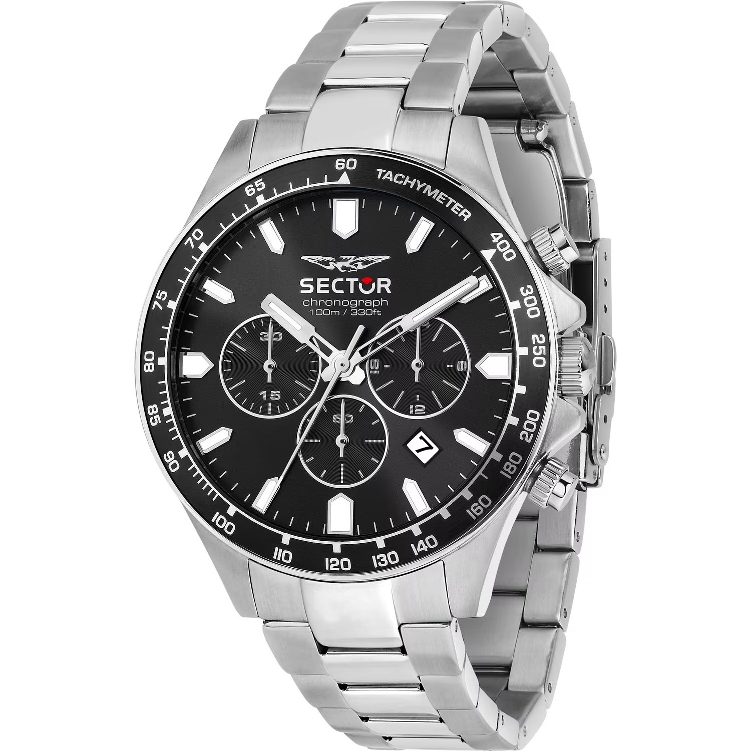 Orologio uomo sector, R3273661054, collezione 230, movimento al quarzo, cronografo, cassa in acciaio 43mm, quadrante nero con datario, bracciale in acciaio, resistenza all'acqua 10atm