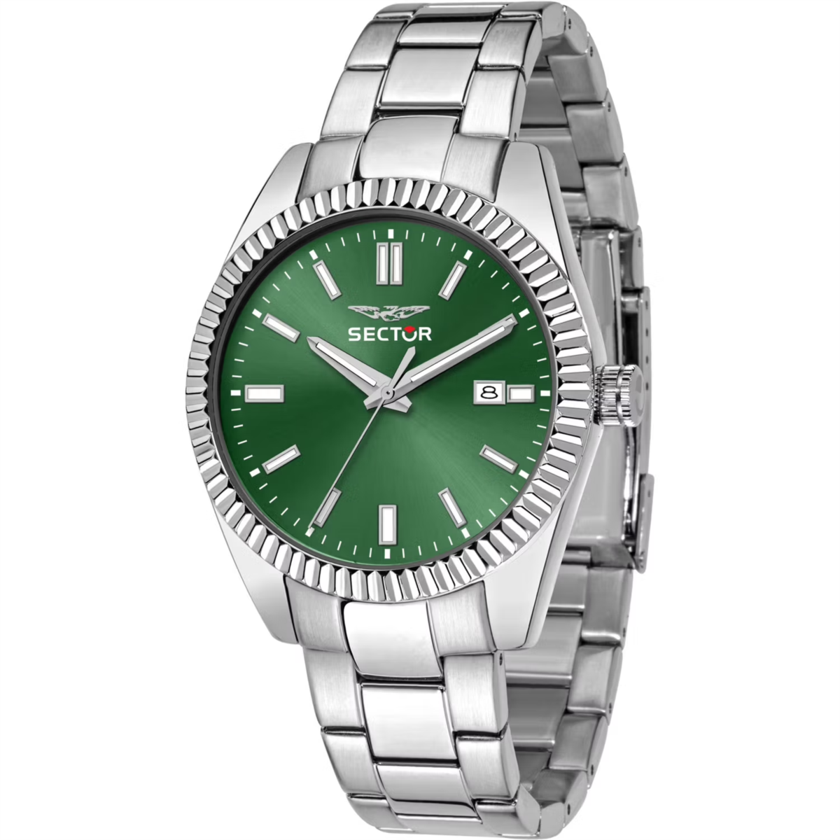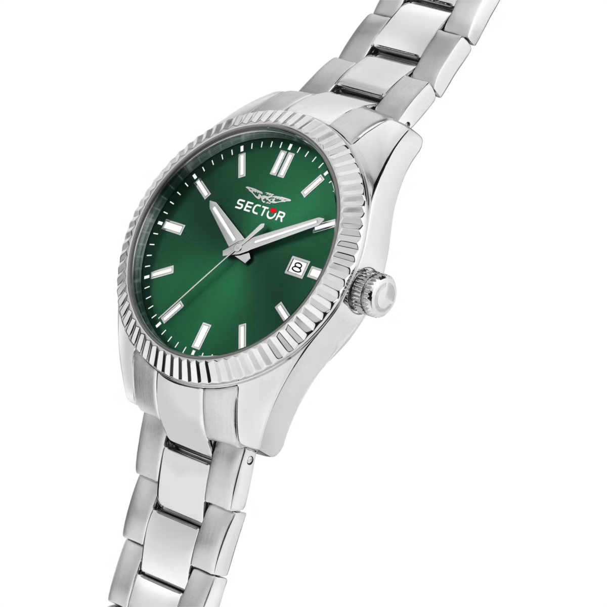 Orologio uomo sector, R3253240048, collezione 240, movimento al quarzo, solo tempo, cassa in acciaio 41mm, quadrante verde con datario, vetro minerale, bracciale in acciaio, resistenza all'acqua 5atm