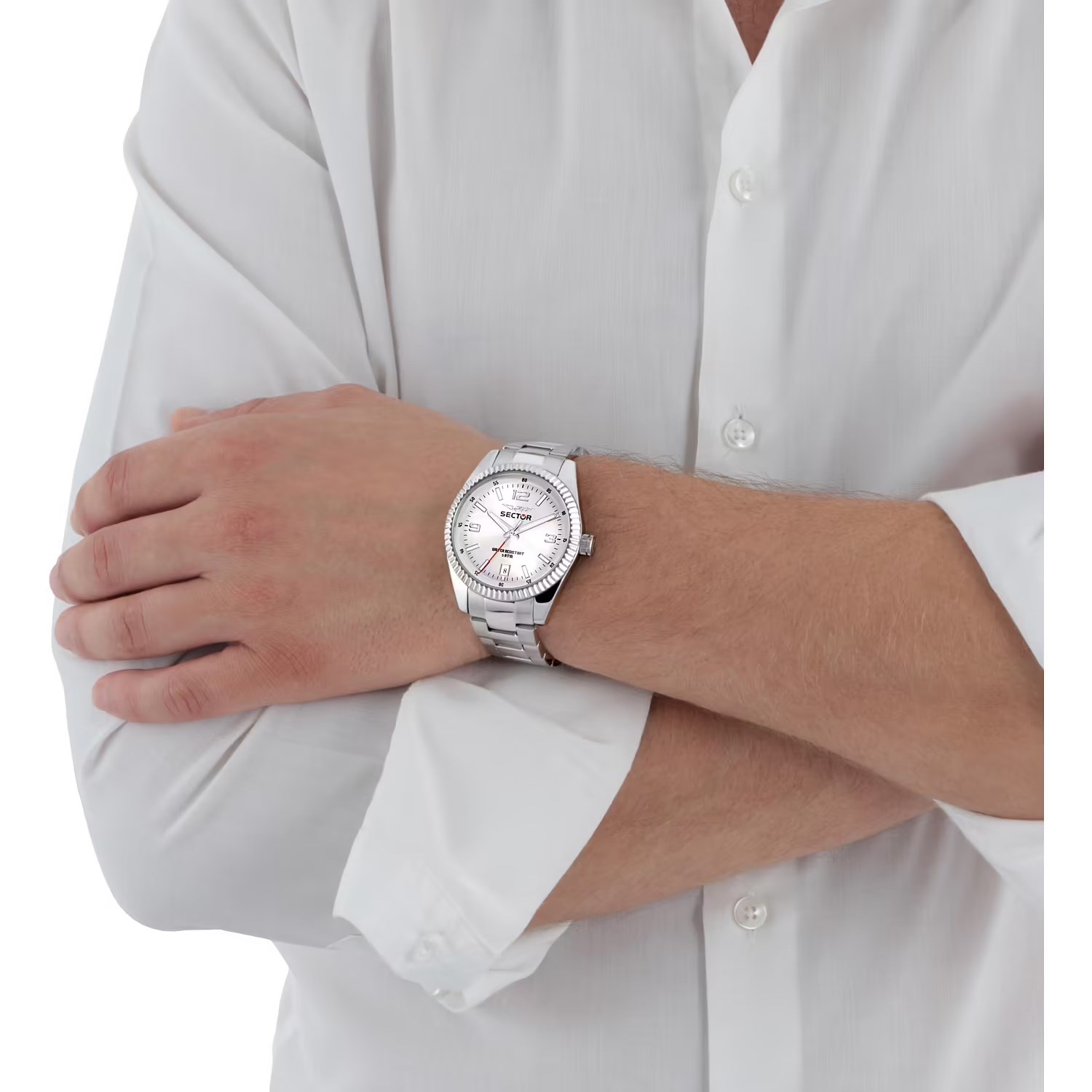 Orologio UOMO sector, R3253476003, collezione 240, con Movimento quarzo analogico, Funzione datario, solo tempo, Materiale cassa acciaio, Materiale cinturino acciaio, Finitura cinturino chiusura deployante Colore quadrante argento Finitura quadrante vetro minerale Impermeabilità 10 atm Dimensioni Cassa 41 mm