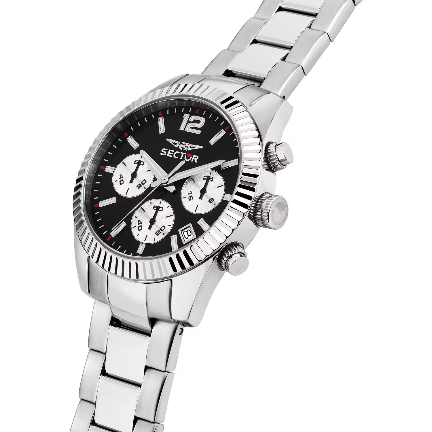 Orologio uomo sector, R3273640029, collezione 240, movimento al quarzo, cronografo, cassa in acciaio 39mm, quadrante nero con datario, vetro minerale, bracciale in acciaio, resistenza all'acqua 5atm