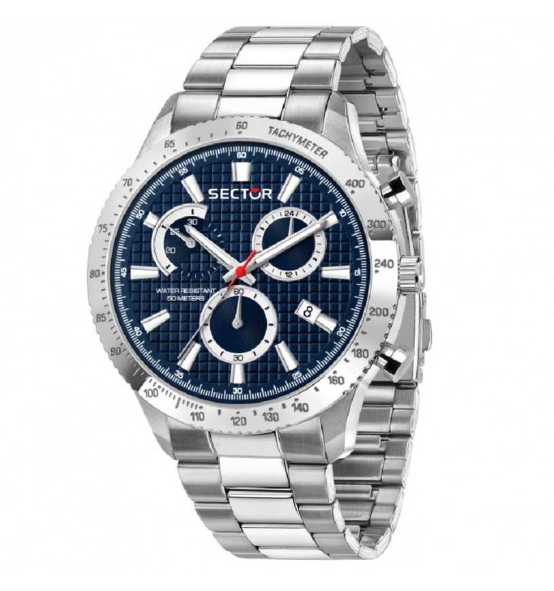 Orologio uomo Sector, R3273778003, collezione 270, movimento al quarzo, cronografo, cassa in acciaio 45mm, quadrante blu con datario, bracciale in acciaio, resistenza all'acqua 5 atm