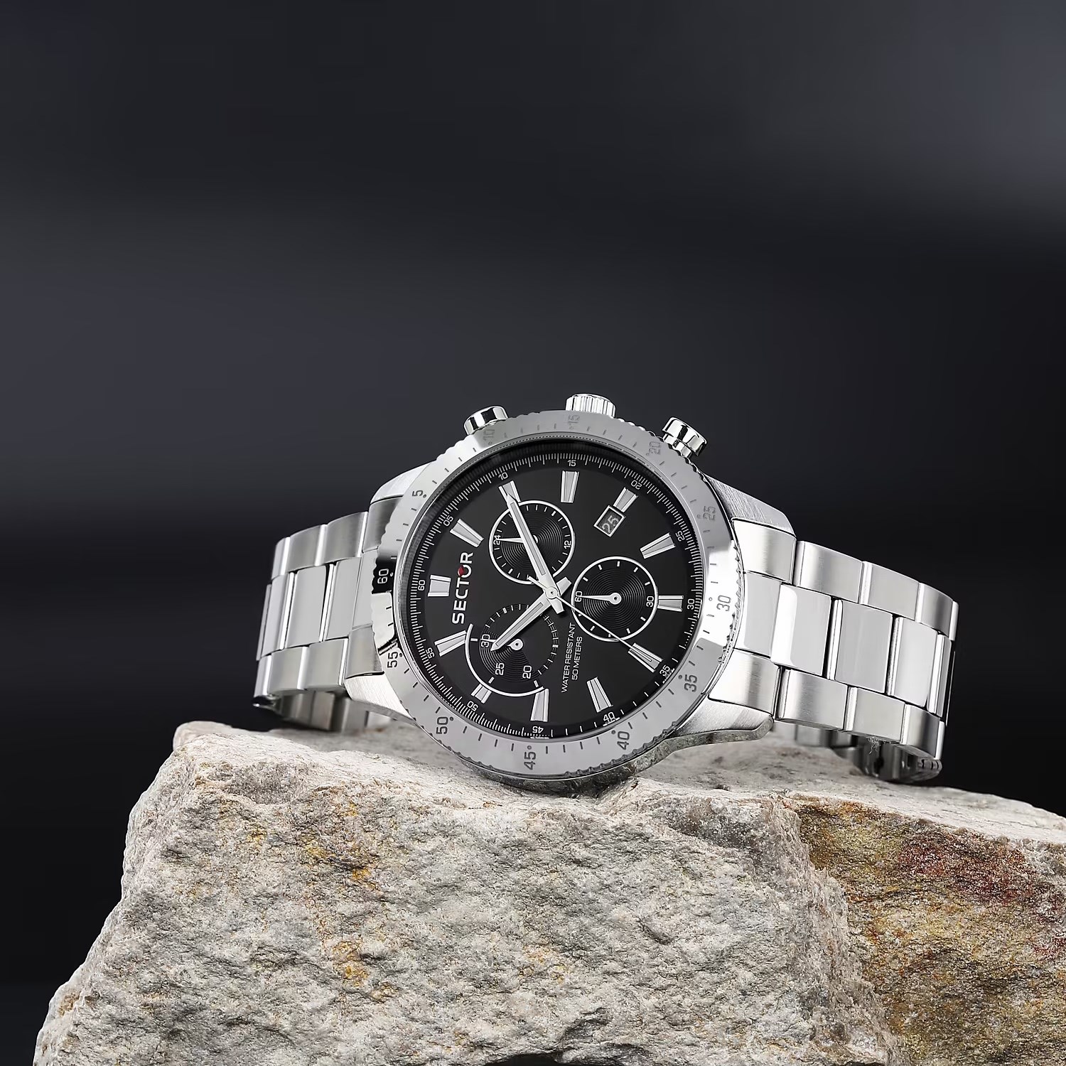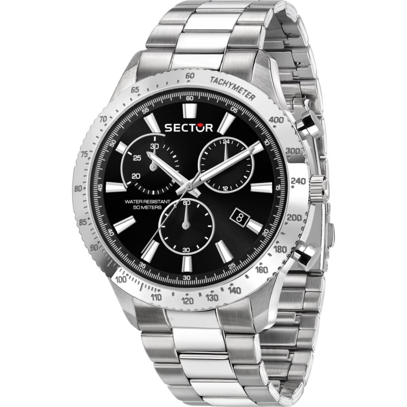 Orologio uomo sector, R3273778005, collezione 270, movimento al quarzo, cronografo, cassa in acciaio 45mm, quadrante nero con datario, bracciale in acciaio, resistenza all'acqua 5atm