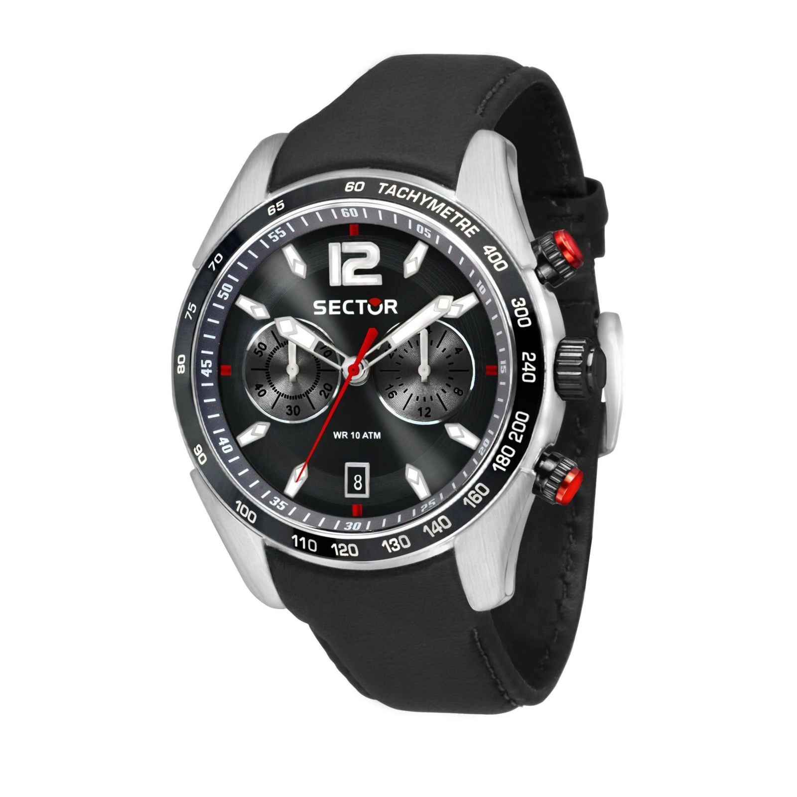 Orologio uomo sector, R3271794004, collezione 330, movimento al quarzo, cronografo, cassa in acciaio 45mm, quadrante nero con datario, cinturino in pelle nera, resistenza all'acqua 10atm