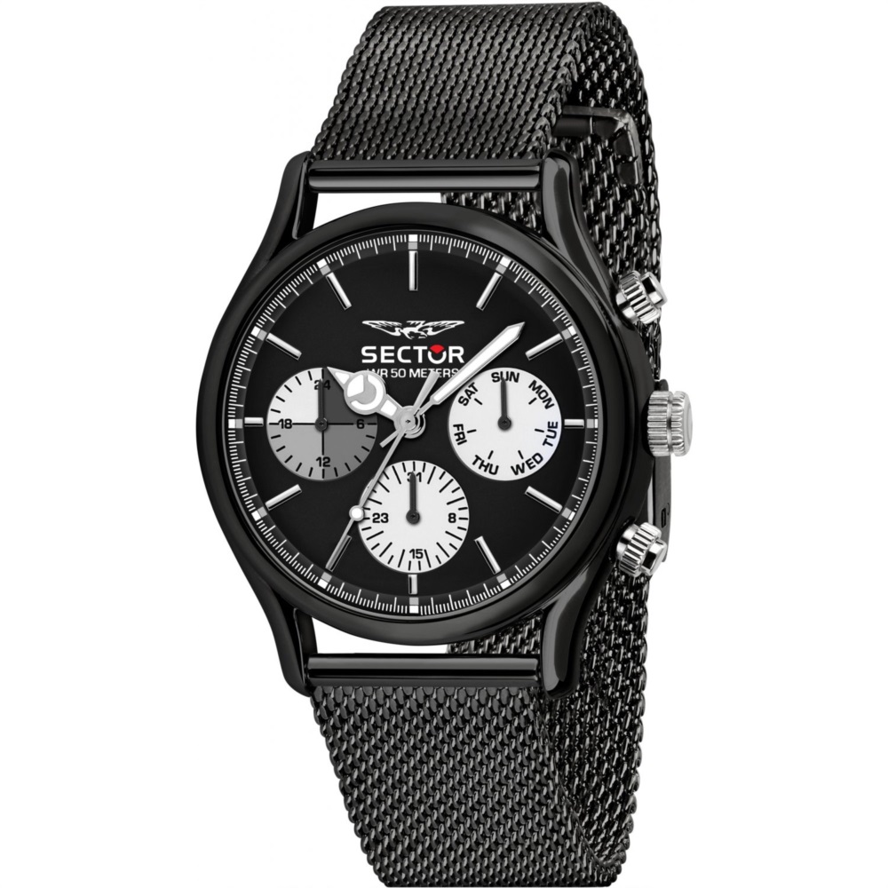 Orologio uomo sector, R3253517003, collezione 660, ; movimento quarzo, multifunzione, cassa in acciaio nero 43mm, quadrante nero con indici silver , bracciale in acciaio nero maglia milano , vetro minerale, chiusura safety lock , resistenza all'acqua 5 atm
