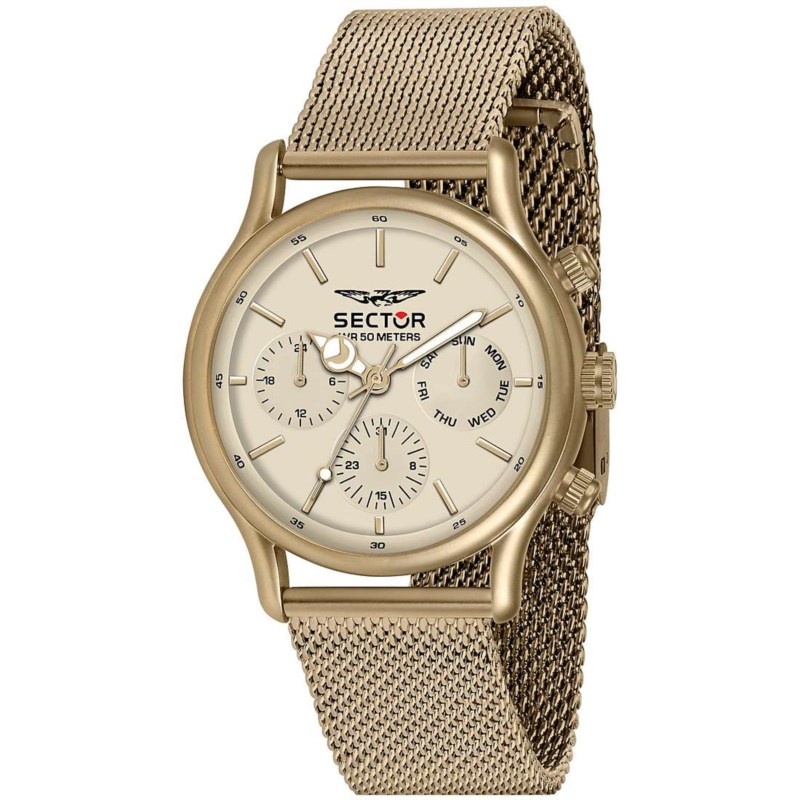 Orologio uomo sector, R3253517015, collezione 660, ; movimento quarzo, multifunzione, cassa in acciaio beige 43mm, quadrante beige, bracciale acciaio beige maglia milano, resistenza all'acqua 5atm