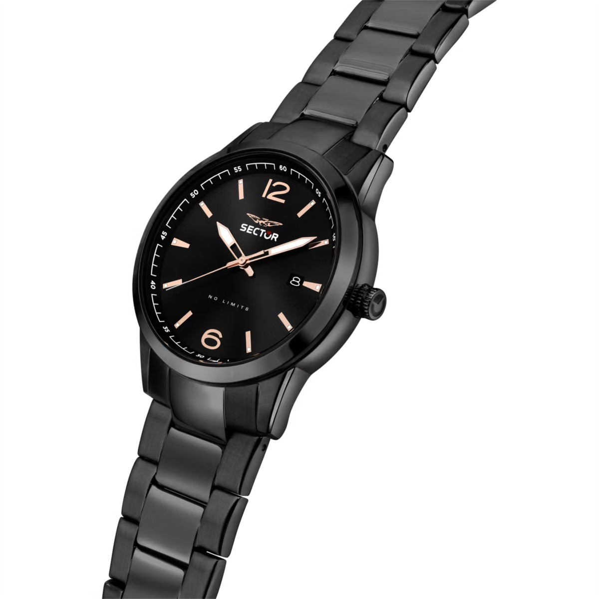 Orologio uomo sector, R3253517027, collezione 660, movimento al quarzo, solo tempo, cassa in acciaio nero 41mm, quadrante nero con datario, bracciale in acciaio nero, resistenza all'acqua 5atm