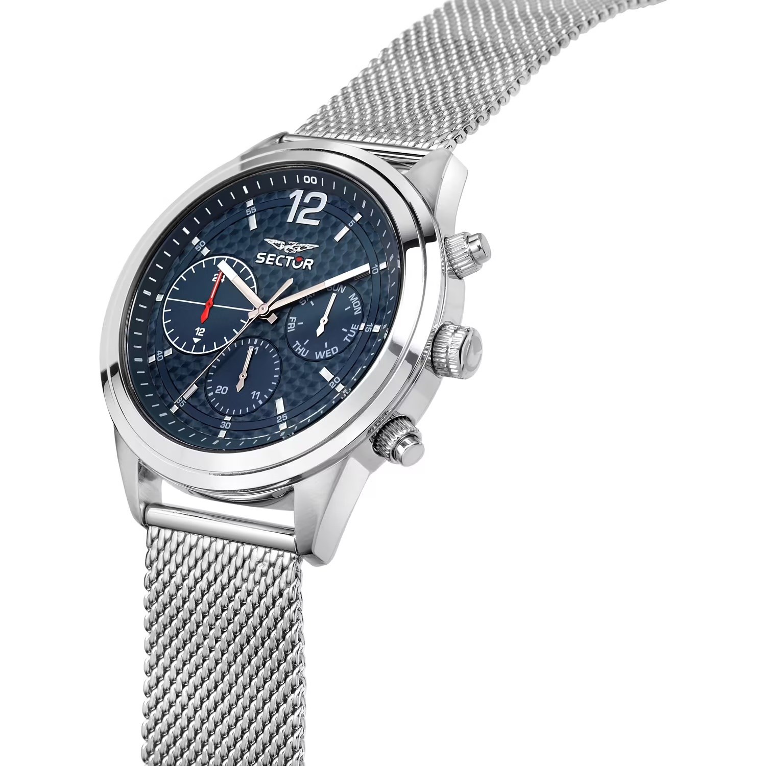 Orologio uomo sector, R3253540003, collezione 670, movimento al quarzo, multifunzione, cassa in acciaio 45mm, quadrante blu, cinturino in maglia milano, resistenza all'acqua 5atm