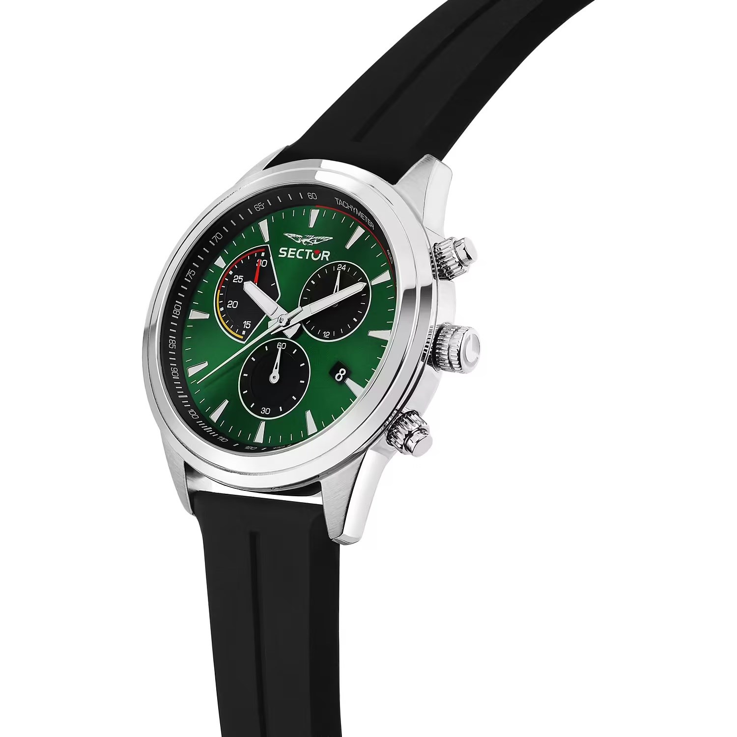 Orologio uomo sector, R3271740002, collezione 670, movimento al quarzo, cronografo, cassa in acciaio 45mm, quadrante verde con datario, vetro minerale, cinturino in silicone, resistenza all'acqua 5atm