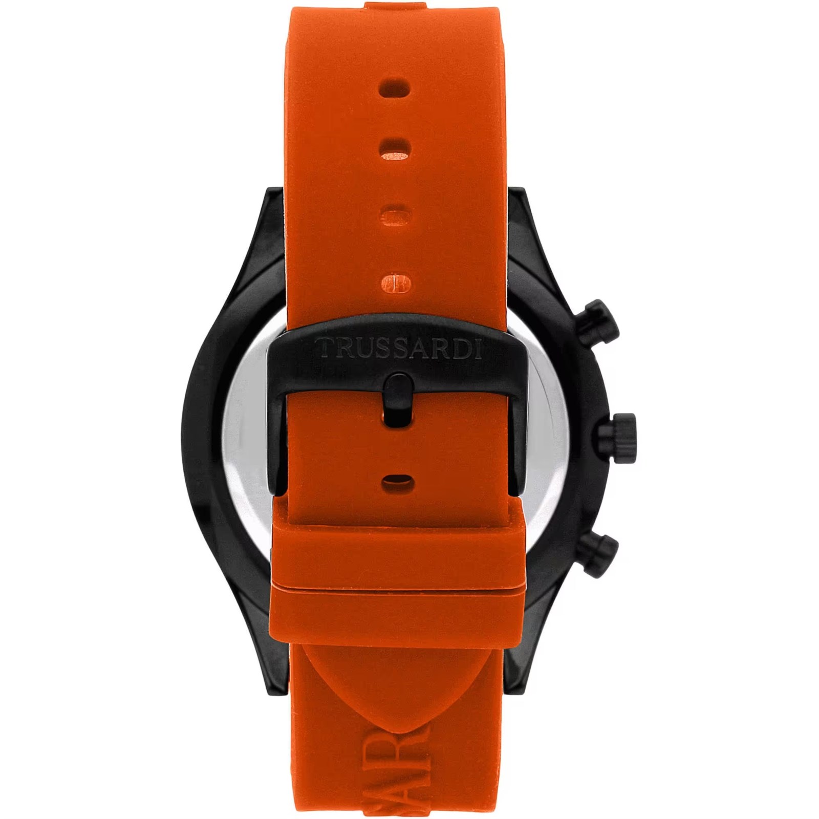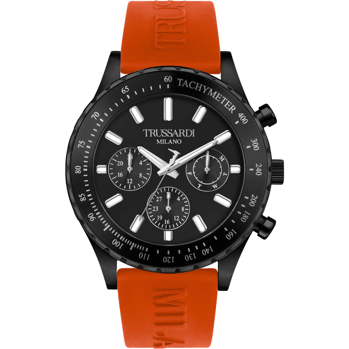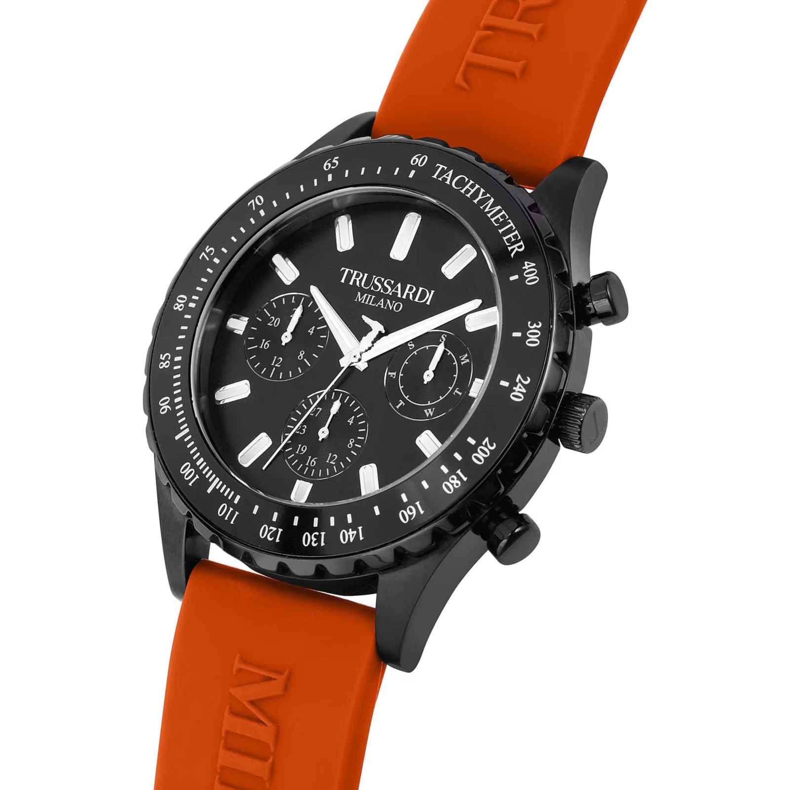 Orologio uomo trussardi, R2451148003, collezione t-logo, movimento al quarzo, multifunzione, cassa in acciaio nero 45mm, quadrante nero, cinturino in silicone, resistenza all'acqua 5atm
