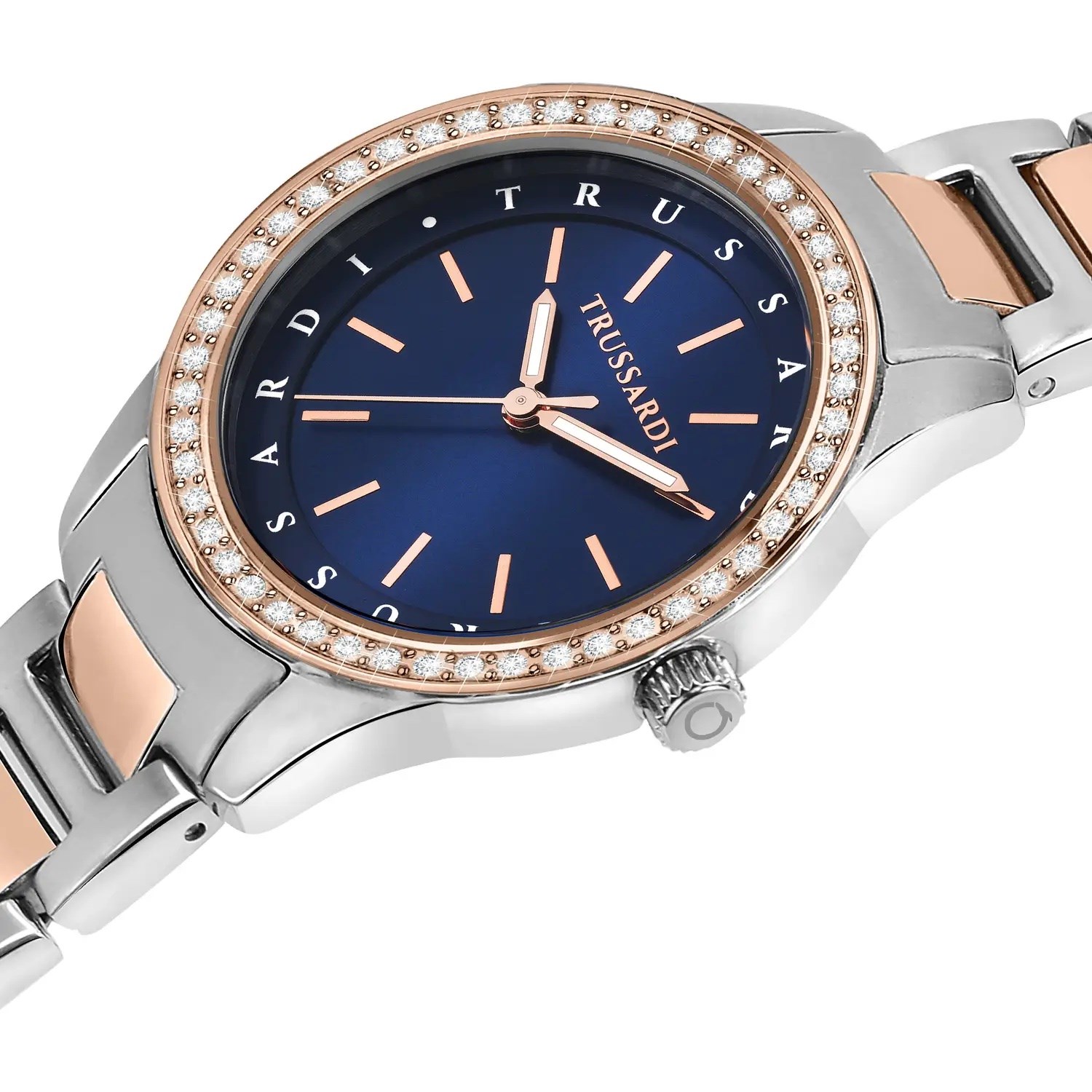 Orologio donna trussardi, R2453151507, collezione t-sky, movimento al quarzo, solo tempo, cassa in acciaio rosato 34mm, quadrante blu, bracciale in metallo/metallo rosato, resistenza all'acqua 5atm