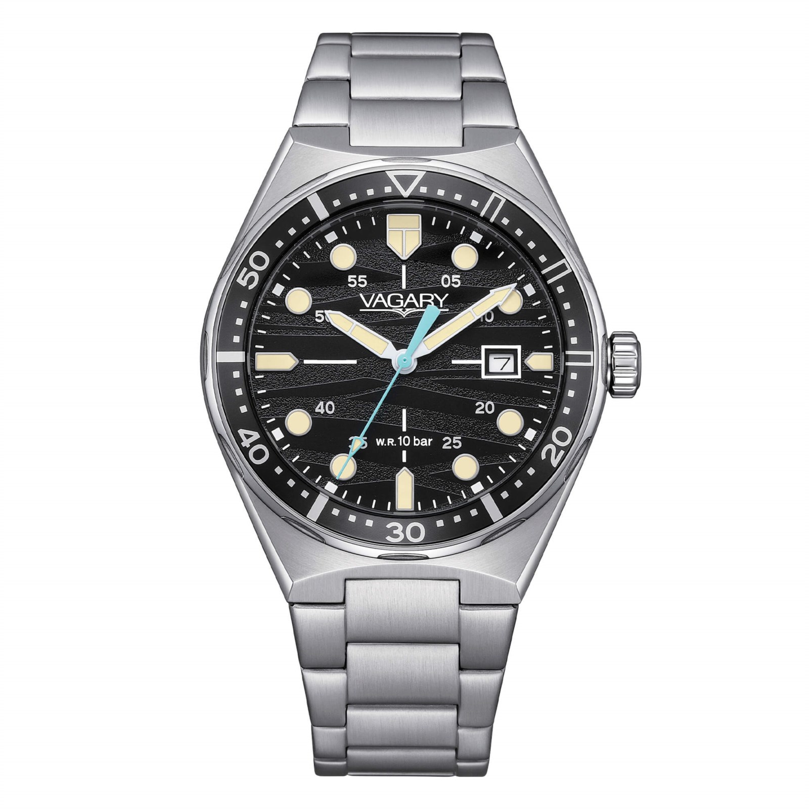 Orologio uomo vagary, IB9-514-51, collezione aqua39, movimento al quarzo, solo tempo, cassa in acciaio 39mm, quadrante nero con datario, bracciale in acciaio, resistenza all'acqua 10 bar