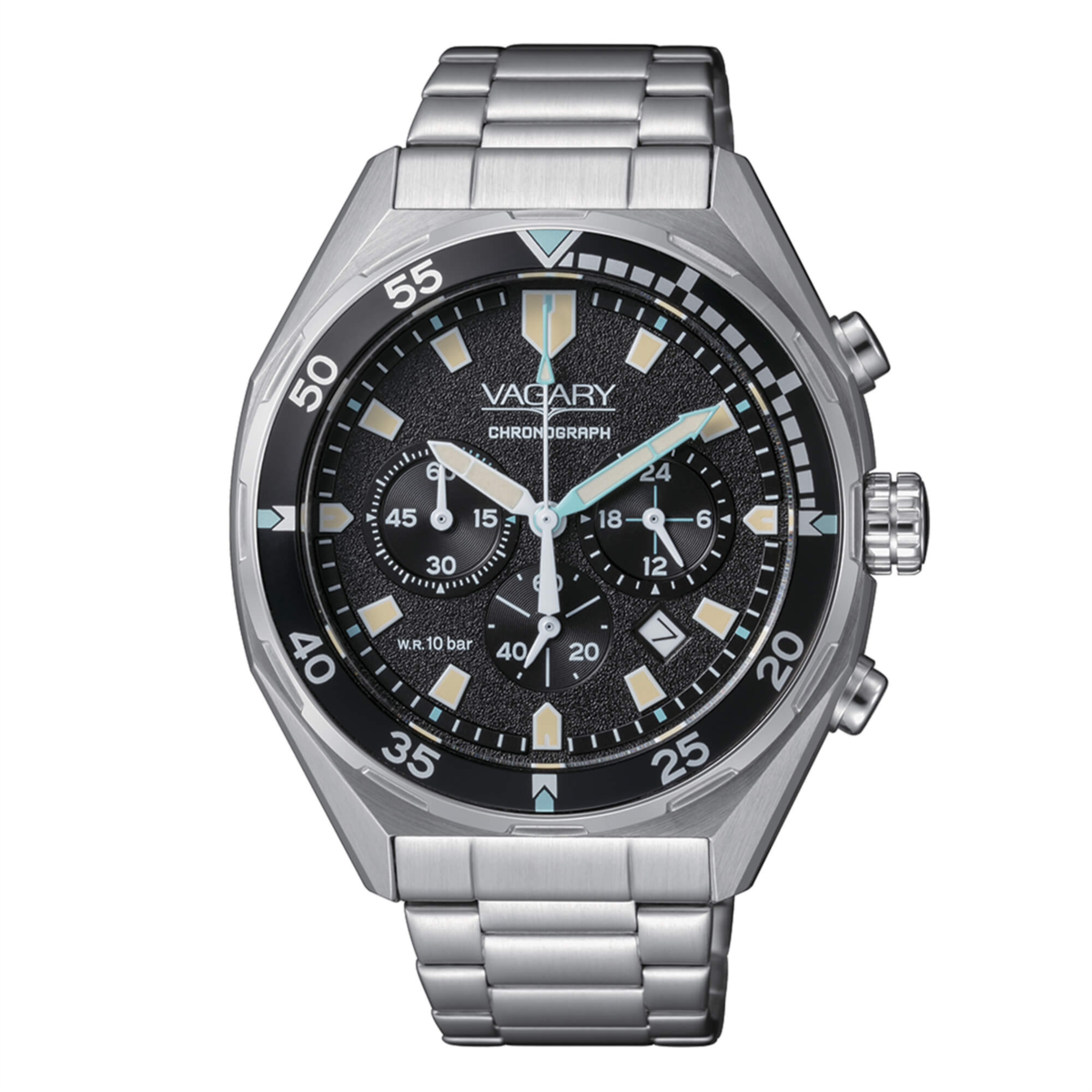 Orologio uomo vagary, IV2-010-51, collezione aqua39, movimento al quarzo, cronografo, cassa in acciaio 41mm, quadrante nero con datario, bracciale in acciaio, resistenza all'acqua 10atm