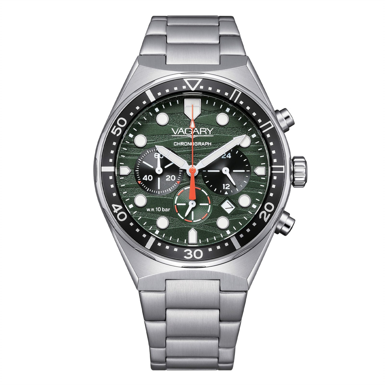 Orologio uomo vagary, IV2-214-41, collezione aqua39, movimento al quarzo, cronografo, cassa in acciaio 40mm, quadrante verde con datario, bracciale in acciaio, resistenza all'acqua 10 bar