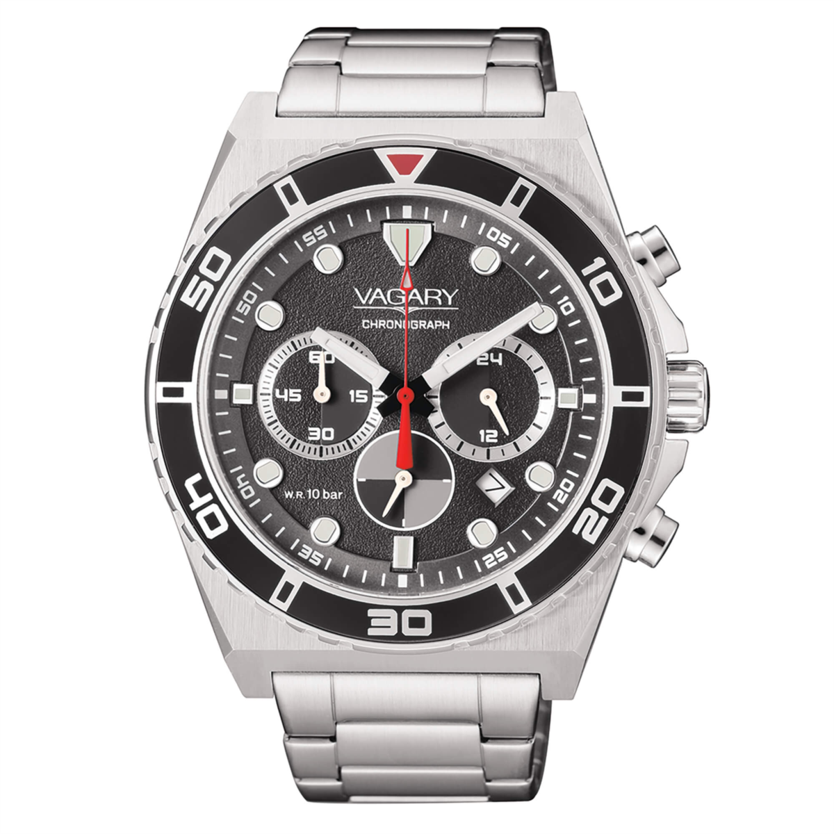 Orologio uomo vagary, IV4-713-51, collezione aqua39, movimento al quarzo, cronografo, cassa in acciaio 43mm, quadrante nero con datario, fondello a vite, vetro minerale, bracciale in acciaio, resistenza all'acqua 10atm