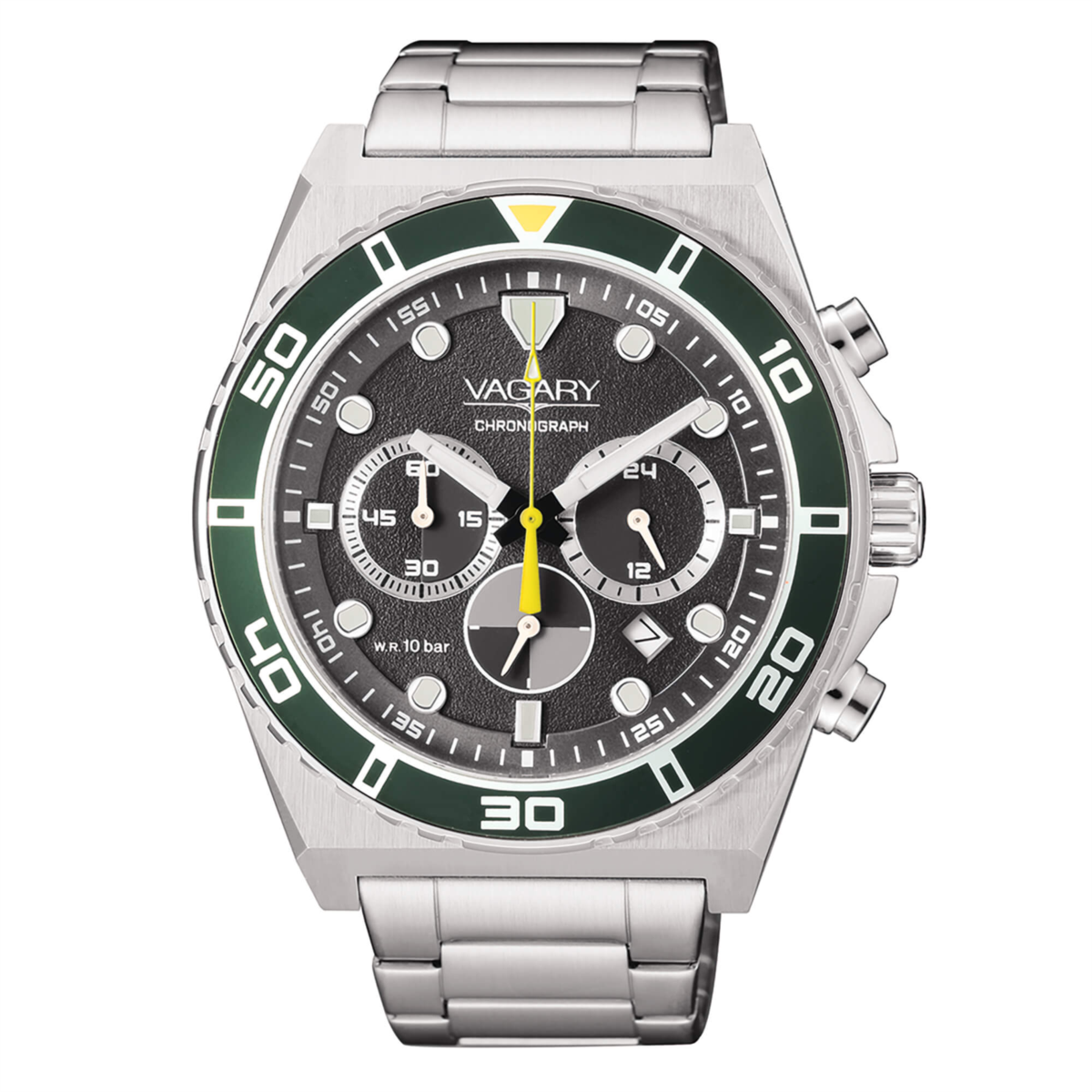Orologio uomo vagary, IV4-713-53, collezione aqua39, movimento al quarzo, cronografo, cassa in acciaio 43mm, quadrante nero con datario, fondello a vite, vetro minerale, bracciale in acciaio, resistenza all'acqua 10atm