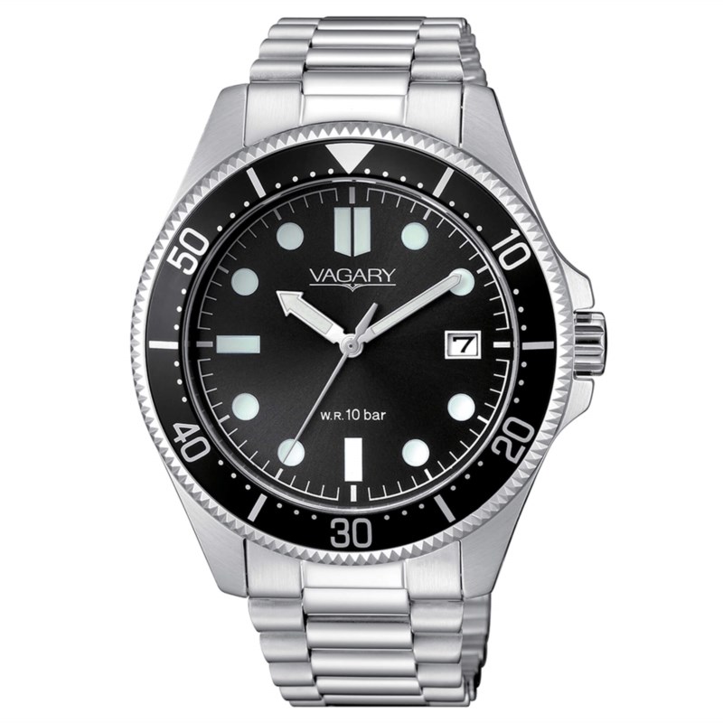 Orologio uomo vagary, VD5-112-51, collezione aqua39, movimento al quarzo, solo tempo, cassa in acciaio 41mm, quadrante nero con datario, bracciale in acciaio, resistenza all'acqua 10atm