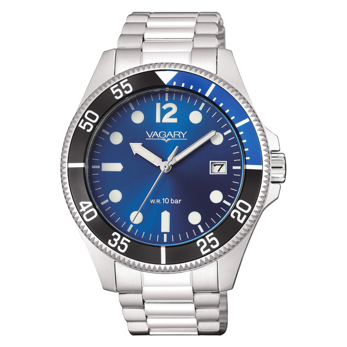 Orologio uomo vagary, VD5-112-73, collezione aqua39, movimento al quarzo, solo tempo, cassa in acciaio 41mm, quadrante blu con datario, fondello a vite, vetro minerale, bracciale in acciaio, resistenza all'acqua 10atm