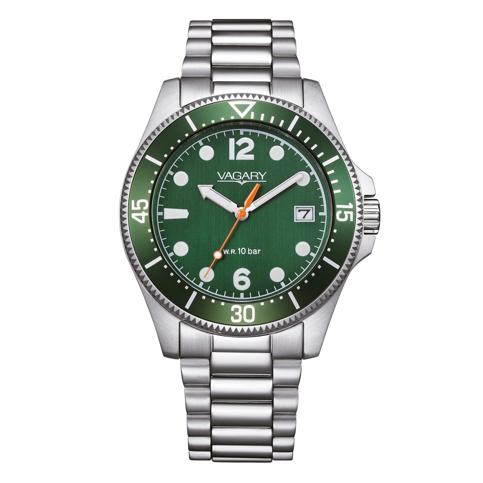 Orologio uomo vagary, VD5-317-41, collezione aqua39, movimento al quarzo, solo tempo, cassa in acciaio 39mm, quadrante verde con datario, bracciale in acciaio, resistenza all'acqua 10 bar