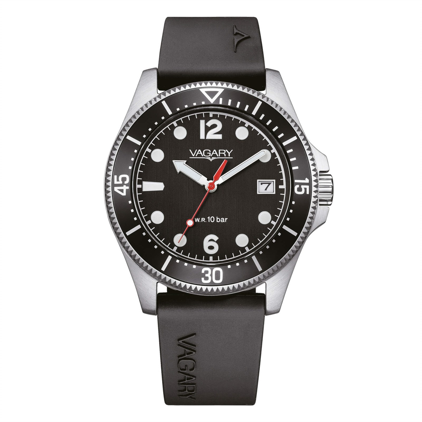 Orologio uomo vagary, VD5-317-50, collezione aqua39, movimento al quarzo, solo tempo, cassa in acciaio 39mm, quadrante nero con datario, cinturino in caucciù, resistenza all'acqua 10 bar