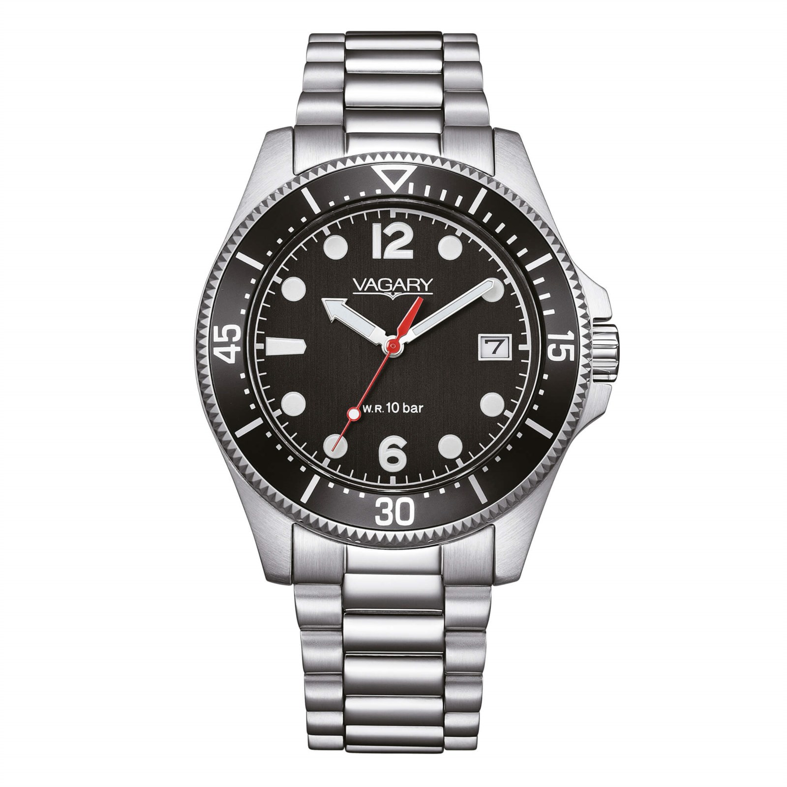 Orologio uomo vagary, VD5-317-51, collezione aqua39, movimento al quarzo, solo tempo, cassa in acciaio 39mm, quadrante nero con datario, bracciale in acciaio, resistenza all'acqua 10 bar