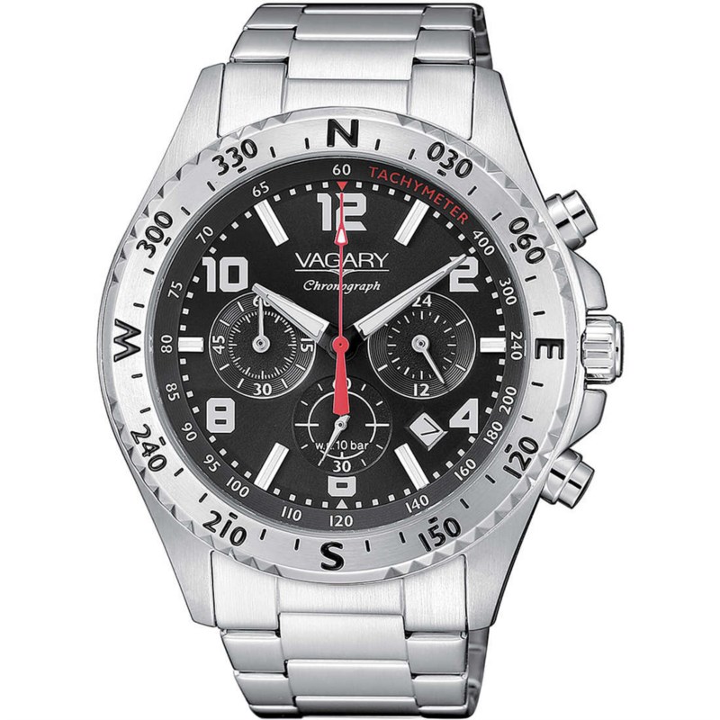 Orologio uomo vagary, Iv4-411-51, collezione explore, movimento al quarzo, cronografo, cassa in acciaio 42mm, quadrante nero con datario, bracciale in acciaio, resistenza all'acqua 10atm