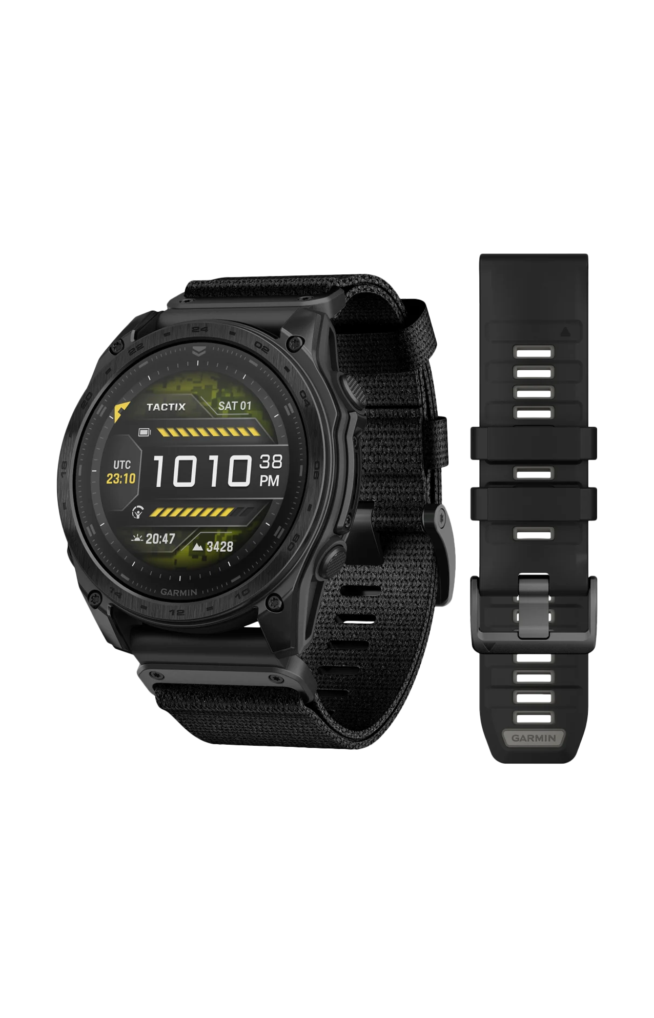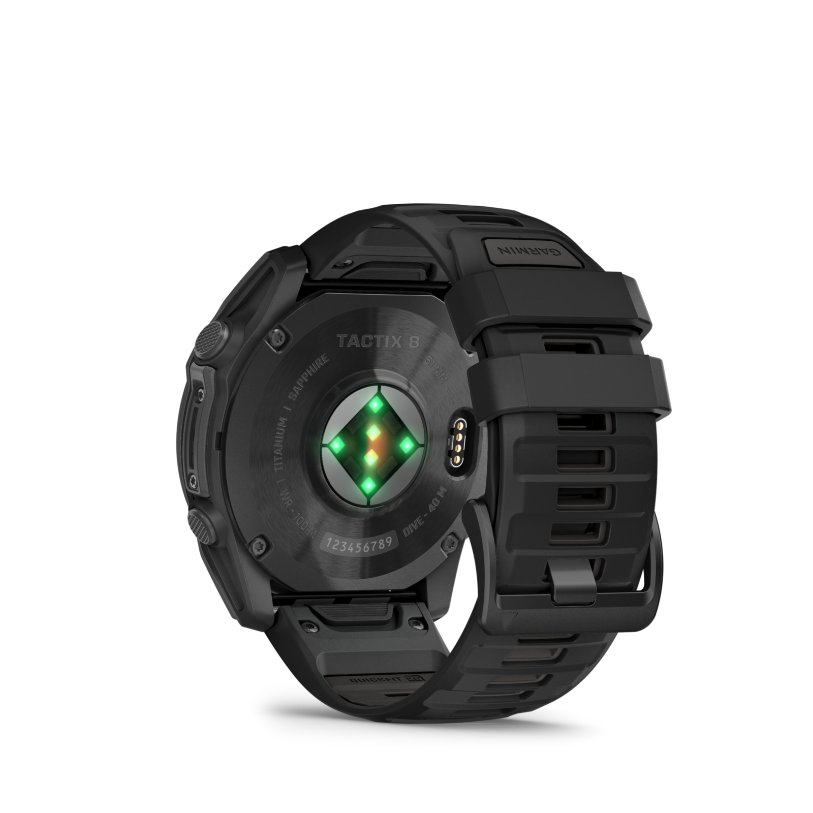 Orologio uomo garmin, 010-03406-01, collezione tactix 8, cassa in Polimeri fibrorinforzati con coperchio posteriore in titanio, lente in cristallo zaffiro, lunetta in titanio, cinturino in silicone, resistenza all'acqua 10atm, connettività BLUETOOTH®, ANT+®, Wi-Fi®, compatibilità iPhone®, Android™ Generale: Punteggio del sonno e Insights, Durata della batteria (in modalità smartwatch) Fino a 29 giorni (always on), Mappe precaricate, Saturazione di ossigeno nel sangue Pulse Ox, Torcia a LED, Garmin Pay™, GPS Multi-band, Memoria musicale, Effettua chiamate e invia messaggi tramite voce, TRAINING READINESS, Training Status, display amoled, Touchscreen, Compatibile con cinturini QuickFit™ incluso 22mm, Pulsanti induttivi a tenuta ermetica, Cassa e microfono integrati, Dimensioni del display: 35, 56 mm (1, 4?) diametro, Risoluzione del display 454x454 pixel, Schermo a colori, Opzione caratteri grandi, tipo di batteria: ioni di litio, Durata della batteria: Smartwatch: fino a 16 giorni (7 always on), Modalità orologio con risparmio energetico: fino a 23 giorni, Solo GPS: fino a 47 ore (37 ore sempre acceso), Tutti i sistemi satellitari: fino a 38 ore (30 ore always on), Tutti i sistemi satellitari + Multibanda: fino a 35 ore (28 ore sempre acceso), Tutti i sistemi satellitari + Musica: fino a 10 ore, Durata massima della batteria in modalità GPS: fino a 81 ore, GPS Expedition: fino a 17 giorni, Memoria/cronologia: 32gb Funzioni Orologio: Ora/data, Sincronizzazione dell'ora tramite GPS, Ora legale automatica, Sveglia, Conto alla rovescia, Cronometro, Orari di alba/tramonto Monitoraggio salute e benessere: Frequenza cardiaca al polso (costante, ogni secondo), Frequenza cardiaca a riposo giornaliera, Avvisi sulla frequenza cardiaca anomala, Frequenza respiratoria (24x7), ETÀ FITNESS, MONITORAGGIO DELL'ENERGIA BODY BATTERY™, Livello di stress quotidiano, Timer respirazione per il rilassamento, Esercizi di respirazione, sonno, coach del sonno, Rilevazione Sonnellini, Idratazione, Salute donna, Istantanea Salute, Temperatura Corporea, Suggerimenti per il Jet Lag Sensori: GPS, GLONASS, Galileo, QZSS, BeiDou, Tecnologia SatIQ™, Cardio da polso Garmin Elevate™, Saturazione Pulse Ox, Altimetro barometrico, Bussola, Giroscopio, Accelerometro, Termometro, Sensore della luce ambientale, sensore di profondità fino a 40mm Fuzioni Smart: Connect IQ™ (quadranti dell'orologio, campi dati, widget e app scaricabili), Connect IQ™ Store sul dispositivo, Smart Notification, Risposta automatica con messaggi preimpostati (solo Android™), Visualizzazione delle immagini dalle notifiche sull'orologio (solo Android™), Report mattutino, Calendario, previsioni meteo, Sincronizzazione delle impostazioni in tempo reale dall'app Garmin Connect™, Risparmio energetico (personalizzabile), Controllo della musica su smartphone, Caricamento e controllo della musica su dispositivo, Find My Phone, Find My Watch, Trova il mio telefono durante un'attività GPS, Compatibile con l'app Garmin Messenger, Controllo Smart Trainer, Compatibile con Garmin Connect™ Mobile, Titoli azionari, Supporto di telefonate BLUETOOTH e assistente vocale, Comando vocale, MODALITÀ RED SHIFT, Garmin Share, Passcode Funzioni tattiche: Modalità stealth, Modalità visione notturna, Coordinate a doppia griglia, KILL SWITCH, Calcolatore balistico Caratteristiche subacquee: Profondità massima di funzionamento per le attività di immersione 40m, Modalità gas singolo, Modalità APNEA, Modello di decompressione, Supporto Nitrox, Miscele di gas, PO2, Avvio/interruzione automatica immersione, Timeout personalizzato di fine immersione, Tappa di sicurezza, Tappe di profondità, Cautela personalizzabile, Indicatore della velocità di risalita/discesa, Regolazione automatica della quota, No fly time, Pianificazione immersione, Maree, Retroilluminazione, Salva automaticamente le posizioni di ingresso e di uscita dell'immersione, Sincronizza il log immersioni su Garmin Dive™ App, Avvisi e allarmi, Bussola per immersioni a 3 assi, Blocco deco assente, Widget sullo stato del subacqueo in superficie Funzioni per l'aeronautica: Database degli aeroporti del mondo, Bussola a 3 assi con HSI, Più fusi orari con Zulu/UTC, Mappa mobile con waypoint per l'aviazione, Database internazionali di NAVAID e incroci, Pulse Ox In-flight, METAR (Meteorological Aerodrome Report), TAF (Terminal Aerodrome Forecast) Funzioni di Monitoraggio Quotidiano: Contapassi, Avvisi di movimento (visualizzati sul dispositivo dopo un periodo di inattività), Obiettivo automatico (memorizza il livello di attività e assegna un obiettivo di passi giornaliero), Calorie bruciate, Piani di scale saliti, Distanza percorsa, Minuti di intensità, TrueUp™, Move IQ™, Sfide di Garmin Connect™, Conteggio automatico delle ripetute Allenamento e piani di allenamento, Profili attività, Funzioni di Sicurezza e Rilevamento, Funzionalità di Gaming, Funzioni Marine, Funzioni di Allenamento, Pianificazione e Analisi, Funzioni per la Corsa, Funzioni di Golf, Funzioni per l'Outdoor, Funzioni di Ciclismo, Funzioni per il Nuoto, Funzioni di rilevamento per bambini