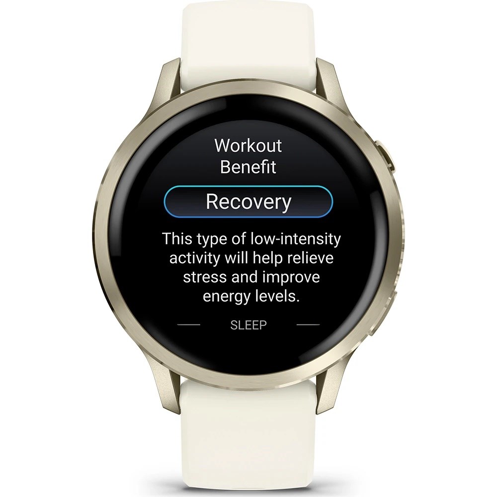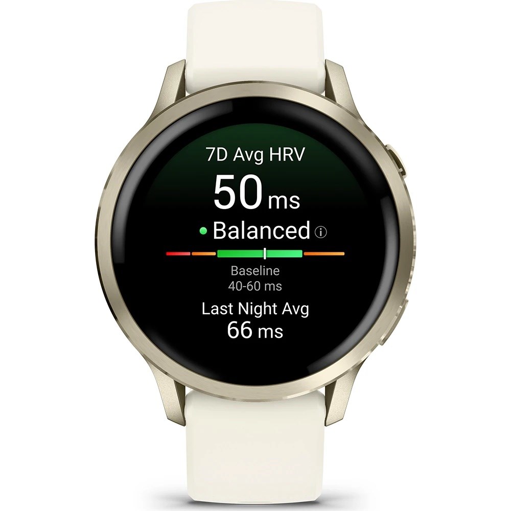 Smartwatch garmin donna, 010-03013-00, collezione venu 4, display amoled, durata della batteria in modalità smartwatch 12 giorni (4 giorni con schermo sempre acceso), effettua chiamate e invia messaggi tramite voce, 5 atm, cinturino in silicone, vetro croning gorilla glass 3, lunetta in acciaio, cassa 45mm in acciaio e fiber-reinforced-polymer, peso 33g, Salute e Benessere Monitoraggio 24/7 di energia (Body Battery™), stress, frequenza cardiaca, HRV, ossigenazione (Pulse Ox), temperatura cutanea e salute femminile. Sonno avanzato: punteggio e suggerimenti personalizzati, analisi delle fasi e coerenza con il ritmo circadiano. Health Snapshot: in 2 minuti registra dati chiave (frequenza cardiaca, respirazione, HRV, ecc.) per un report medico. Stato di salute (Beta): rileva variazioni anomale delle metriche rispetto ai tuoi standard. Morning/Evening Report: riepilogo giornaliero su sonno, recupero, meteo e impegni. Meditazione e Jet Lag: sessioni guidate per ridurre stress e ottimizzare il ritmo sonno-veglia. Fitness e Allenamento Oltre 80 profili sport indoor/outdoor (corsa, ciclismo, forza, yoga, golf, triathlon, ecc.). Allenamenti personalizzati: Garmin Coach, piani di forza funzionale, HIIT e video workout sul display. Training Readiness e Recovery: valutano quanto sei pronto ad allenarti e quanto recupero serve. Potenza e dinamiche di corsa: misurano cadenza, falcata, contatto col suolo e sforzo. GPS multi-band SatIQ™: massima precisione e durata batteria ottimizzata. Età fitness: stima la tua forma fisica rispetto all’età reale. Modalità sedia a rotelle e multi-attività per sessioni combinate. Connettività e Funzioni Smart Telefonate e messaggi dal polso (anche con tastiera su Android). Notifiche smart e visualizzazione foto (Android). Musica offline da Spotify, Deezer o Amazon Music. Pagamenti contactless Garmin Pay™. Sicurezza: rilevamento incidenti e invio posizione in tempo reale. Google Maps™ integrato per indicazioni curva per curva. Garmin Connect per analisi dati, sfide e condivisione. Personalizzazione e Praticità Quadranti, colori e caratteri personalizzabili. Modalità focus, torcia LED, timer, cronometro e calendario sincronizzato. Filtro blu e variazione colore per ridurre l’affaticamento visivo.