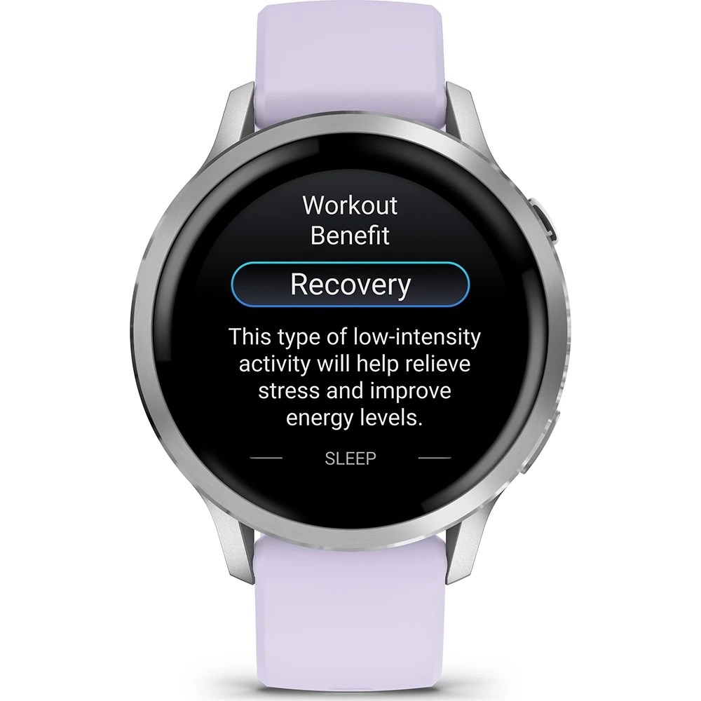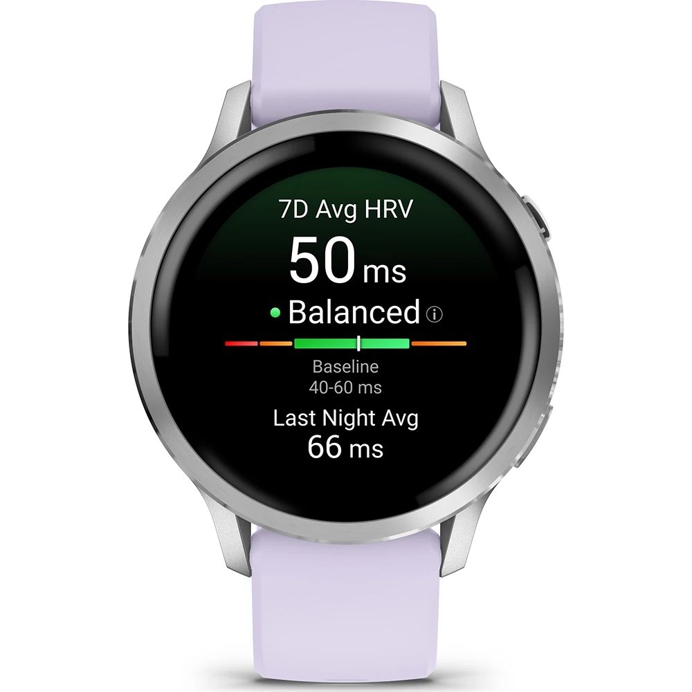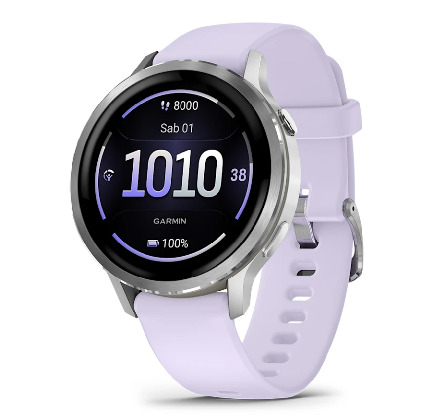 Smartwatch garmin donna, 010-03013-01, collezione venu 4, display amoled, durata della batteria in modalità smartwatch 12 giorni (4 giorni con schermo sempre acceso), effettua chiamate e invia messaggi tramite voce, 5 atm, cinturino in silicone, vetro croning gorilla glass 3, lunetta in acciaio, cassa 45mm in acciaio e fiber-reinforced-polymer, peso 33g, Salute e Benessere Monitoraggio 24/7 di energia (Body Battery™), stress, frequenza cardiaca, HRV, ossigenazione (Pulse Ox), temperatura cutanea e salute femminile. Sonno avanzato: punteggio e suggerimenti personalizzati, analisi delle fasi e coerenza con il ritmo circadiano. Health Snapshot: in 2 minuti registra dati chiave (frequenza cardiaca, respirazione, HRV, ecc.) per un report medico. Stato di salute (Beta): rileva variazioni anomale delle metriche rispetto ai tuoi standard. Morning/Evening Report: riepilogo giornaliero su sonno, recupero, meteo e impegni. Meditazione e Jet Lag: sessioni guidate per ridurre stress e ottimizzare il ritmo sonno-veglia. Fitness e Allenamento Oltre 80 profili sport indoor/outdoor (corsa, ciclismo, forza, yoga, golf, triathlon, ecc.). Allenamenti personalizzati: Garmin Coach, piani di forza funzionale, HIIT e video workout sul display. Training Readiness e Recovery: valutano quanto sei pronto ad allenarti e quanto recupero serve. Potenza e dinamiche di corsa: misurano cadenza, falcata, contatto col suolo e sforzo. GPS multi-band SatIQ™: massima precisione e durata batteria ottimizzata. Età fitness: stima la tua forma fisica rispetto all’età reale. Modalità sedia a rotelle e multi-attività per sessioni combinate. Connettività e Funzioni Smart Telefonate e messaggi dal polso (anche con tastiera su Android). Notifiche smart e visualizzazione foto (Android). Musica offline da Spotify, Deezer o Amazon Music. Pagamenti contactless Garmin Pay™. Sicurezza: rilevamento incidenti e invio posizione in tempo reale. Google Maps™ integrato per indicazioni curva per curva. Garmin Connect per analisi dati, sfide e condivisione. Personalizzazione e Praticità Quadranti, colori e caratteri personalizzabili. Modalità focus, torcia LED, timer, cronometro e calendario sincronizzato. Filtro blu e variazione colore per ridurre l’affaticamento visivo.