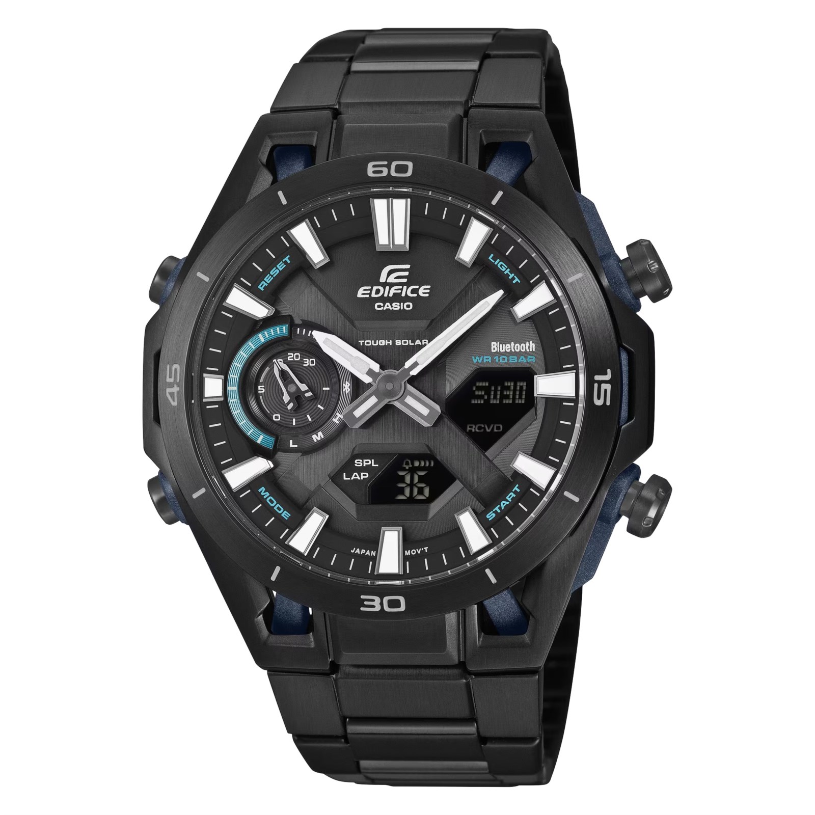 Orologio uomo edifice, ECB-2300DC-1AEF, collezione serie ecb-2000, movimento solare, cronografo, cassa in acciaio nero 50.2 × 45.8 × 10.9 mm, bracciale in acciaio nero, resistenza all'acqua 10 bar Mobile Link (collegamento wireless tramite Bluetooth®), Regolazione orologio automatica, Impostazione semplice dell'orologio, Ora internazionale di circa 300 città, Trasferimento dei dati del cronometro, ora e posizione, trova telefono, vetro minerale, neobrite, Ora internazionale 38 fusi orari (38 città + tempo coordinato universale), visualizzazione del codice della città, visualizzazione del nome della città, attivazione/disattivazione dell'ora legale, passaggio automatico all'ora legale (DST), commutazione città per l'ora del proprio fuso orario/ora internazionale, cronometro, timer, 5 promemoria sonori giornalieri (con segnale acustico di avanzamento), segnale orario, Doppia luce LED Luce LED per il quadrante (Super Illuminator, durata illuminazione selezionabile (1, 5 secondi o 3 secondi), luminescenza), Retroilluminazione a LED per il display digitale (Super Illuminator, durata illuminazione selezionabile (1, 5 secondi o 3 secondi), luminescenza), luce led bianco, Calendario automatico completo (fino all'anno 2099), Attivazione/disattivazione del segnale acustico di pressione pulsanti, Risparmio energetico (il display si spegne per risparmiare energia quando l'orologio viene lasciato al buio), Visualizzazione/avviso dello stato della batteria, cronometraggio della corsa, Precisione: ±15 secondi al mese, Formato 12/24 ore, Visualizzazione giorno (giorni della settimana selezionabili in sei lingue), Funzione di spostamento delle lancette (le lancette si spostano per non bloccare la visualizzazione del contenuto del display digitale).