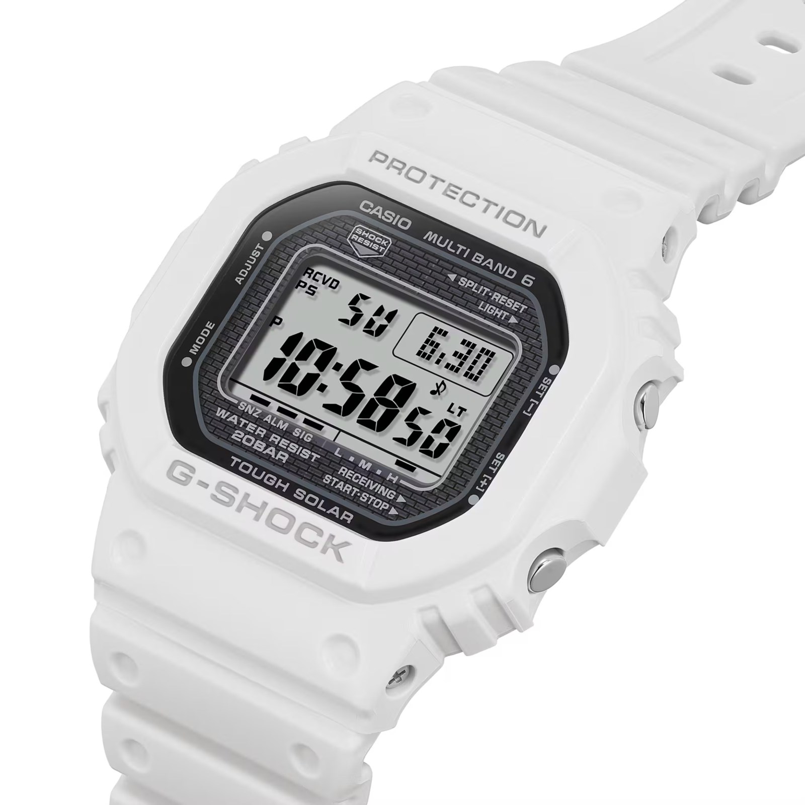 Orologio uomo g-shock, GW-5000HS-7ER, collezione serie gw-5000, movimento solare, digitale, radiocontrollato, cassa in resina a base biologica 48.9 × 42.8 × 13.5 mm, lunetta in acciaio inossidabile, cinturino in resina a base biologica, resistenza all'acqua 20 bar Resistente agli urti, Vetro minerale, Rivestimento simile al diamante, 5 Ore internazionali 31 fusi orari (48 città + tempo coordinato universale), attivazione/disattivazione dell'ora legale, passaggio dall'ora locale all'ora internazionale, cronometro, timer, 5 promemoria sonori giornalieri (con 1 promemoria sonoro ritardato), Segnale orario, Retroilluminazione LED (Super Illuminator) Illuminazione LED completamente automatica, durata dell'illuminazione selezionabile (1, 5 secondi o 3 secondi), luminescenza, luce led bianco, Calendario automatico completo (fino all'anno 2099), Attivazione/disattivazione del segnale acustico di pressione pulsanti, Risparmio energetico (il display si spegne per risparmiare energia quando l'orologio viene lasciato al buio), Visualizzazione/avviso dello stato della batteria, Cronometraggio della corsa, Precisione: ±15 secondi al mese, Commutazione visualizzazione data/mese, Visualizzazione giorno (giorni della settimana selezionabili in sei lingue), Indicazione dell'ora regolare: ora, minuto, secondo, pm, mese, data, giorno del mese, Ricezione del segnale di calibrazione dell'ora, Ricezione automatica fino a sei* volte al giorno (le rimanenti ricezioni automatiche vengono annullate quando l'operazione è riuscita), *5 volte al giorno per il segnale di calibrazione cinese, Ricezione manuale, I risultati più recenti della ricezione del segnale, Segnali di calibrazione dell'ora, Nome stazione: DCF77 (Mainflingen, Germania) Frequenza: 77, 5 kHz, Nome stazione: MSF (Anthorn, Inghilterra) Frequenza: 60, 0 kHz Nome stazione: WWVB (Fort Collins, Stati Uniti) Frequenza: 60, 0 kHz Nome stazione: JJY (Fukushima, Fukuoka/Saga, Giappone) Frequenza: 40, 0 kHz (Fukushima)/60, 0 kHz (Fukuoka/Saga) Nome stazione: BPC (Shangqiu City, provincia di Henan, Cina) Frequenza: 68, 5 kHz